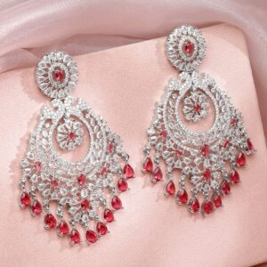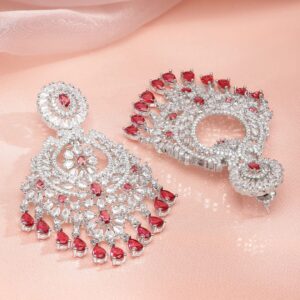 Earrings : These rhodium-plated chandelier earrings feature cascading ruby pink teardrops with brilliant white cubic zirconia accents. A luxurious statement piece for women & girls for parties & special occasions. Occasion : Bring your style to a whole new level with this handcrafted piece of jewellery. When you’re celebrating a special Occasion : – a birthday, wedding, parties or personal milestone – this piece adds that extra something that makes us feel special and looking our best. Material : & Care Dimension : Length : 9 cm , Width: 5.5 cm Net Weight: 59.43 Gram Net Quantity : 1 Pair Of Earrings Material : Brass Care Label : It is advisable to avoid contact with water and organic chemicals i.e. perfume sprays. Store jewellery in airtight box. After use, wipe the jewellery with soft cotton cloth.