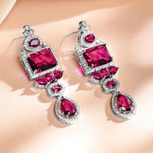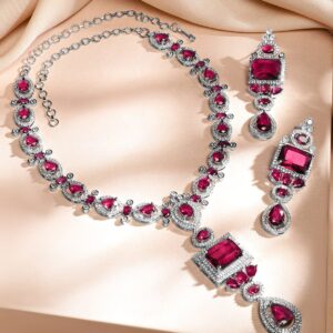 This premium rhodium-plated jewellery set features a stunning necklace and matching earrings, adorned with dazzling ruby pink and white cubic zirconia stones. The intricate craftsmanship and elegant design make it a perfect choice for special occasion Occasion : Bring your style to a whole new level with this handcrafted piece of jewellery. When you’re celebrating a special Occasion : – a birthday, wedding, festive or personal milestone – this piece adds that extra something that makes us feel special and looking our best. Material : & Care Dimension : Length : Neckace : 42 cm, Earrings : 7 cm Net Weight: 72 g Net Quantity : 1 Necklace & 1 Pair of Earrings Material : Brass Care Label : It is advisable to avoid contact with water and organic chemicals i.e. perfume sprays. Store jewellery in airtight box. After use, wipe the jewellery with soft cotton cloth.