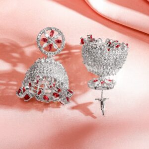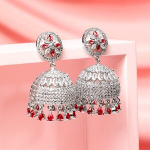 Earrings : These rhodium-plated jhumkas feature ruby red AD drop beads, Cubic Zirconia, and a floral stud top—perfect for enhancing ethnic looks during festive and special traditional occasions. Occasion Ready: Perfect for festive wear, traditional ceremonies, or ethnic styling. These jhumkas beautifully complement sarees, lehengas, or indo-western looks with elegance and statement allure. Material : & Care Dimension : Size : Length : 5 cm, Width : 2 cm Net Quantity : 1 Pair Of Earrings Net Weight: 28.73 Gram Material : Brass Care Label : It is advisable to avoid contact with water and organic chemicals i.e. perfume sprays. Store jewellery in airtight box. After use, wipe the jewellery with soft cotton cloth.