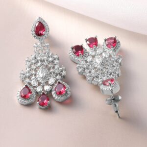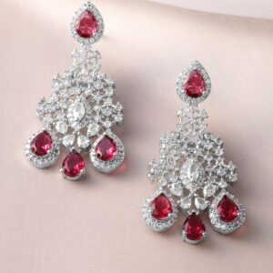 Jewellery Set : Exude elegance with this rhodium-plated necklace set, adorned with stunning ruby red teardrop stones and sparkling white cubic zirconia. The intricately designed necklace beautifully complements the matching earrings, making this set perfect for adding a touch of luxury to your evening attire. Ideal for those special moments, this set is a timeless addition to your jewelry collection. Occasion : Bring your style to a whole new level with this handcrafted piece of jewellery. When you’re celebrating a special Occasion : – a birthday, wedding, or personal milestone – this piece adds that extra something that makes us feel special and looking our best. Material : & Care Dimension : Size : Necklace : 10 cm, Earrings : 5.5 cm Material :Brass Care Label : It is advisable to avoid contact with water and organic chemicals i.e. perfume sprays. Store jewellery in airtight box. After use, wipe the jewellery with soft cotton cloth.