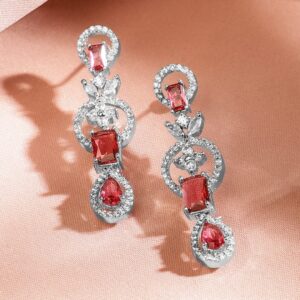 This rhodium-plated necklace set features an exquisite combination of ruby red and white cubic zirconia stones, creating a regal and sophisticated look. The graceful design includes a statement necklace with cascading gemstones and matching earrings, making it a timeless addition to any jewelry collection. Occasion : Bring your style to a whole new level with this handcrafted piece of jewelry. When you’re celebrating a special Occasion : – a birthday, wedding, festive or personal milestone – this piece adds that extra something that makes us feel special and looking our best. Material : & Care Dimension : Length : NS- 15 ; E- 4 cm W: 4 cm Material: Brass Net Weight: 35.04 Gram Net Quantity: 1 Necklace & 1 Pair of Earrings Care Label: It is advisable to avoid contact with water and organic chemicals i.e. perfume sprays. Store jewellery in airtight box. After use, wipe the jewellery with soft cotton cloth.