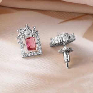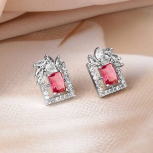 Earrings : Elevate your style with these rhodium-plated geometric stud earrings, featuring a striking combination of ruby red and white cubic zirconia stones. The unique design is adorned with a red center stone, complemented by sparkling white stones arranged in a modern, geometric pattern. These earrings are perfect for adding a pop of color and elegance to any ensemble, making them a versatile addition to your jewelry collection. Occasion : Bring your style to a whole new level with this handcrafted piece of jewellery. When you’re celebrating a special Occasion : – a birthday, wedding, or personal milestone – this piece adds that extra something that makes us feel special and looking our best. Material : & Care Dimension : Size : Length : 1.5 cm, Width : 1 cm Material :Brass Care Label : It is advisable to avoid contact with water and organic chemicals i.e. perfume sprays. Store jewellery in airtight box. After use, wipe the jewellery with soft cotton cloth.