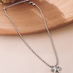 Necklace and Chains : Elevate your style with this chic Rhodium Plated silver beaded chain necklace, featuring a minimalist bow pendant. The delicate beads and sleek bow design combine to create an effortlessly elegant look, perfect for layering or wearing solo. Crafted with a modern aesthetic, this necklace is a versatile accessory that adds a touch of understated glamour to any ensemble. Occasion : Bring your style to a whole new level with this handcrafted piece of jewellery. When you’re celebrating a special Occasion : – a birthday, wedding, or personal milestone – this piece adds that extra something that makes us feel special and looking our best. Material : & Care Dimension : Size : Length : 44 cm, Width : 2 cm Material :Brass Weight : 8.56g Net Qnty : 1 Necklace Care Label : It is advisable to avoid contact with water and organic chemicals i.e. perfume sprays. Store jewellery in airtight box. After use, wipe the jewellery with soft cotton cloth.