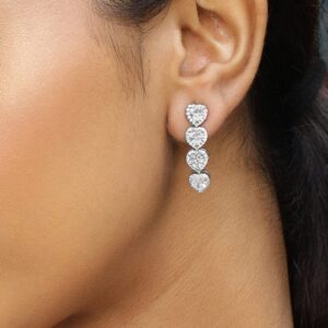 Earrings : Elegantly designed rhodium-plated drop earrings featuring dazzling heart-shaped cubic zirconia stones in a cascading design. These premium earrings exude sophistication and charm, making them a perfect choice for romantic occasions and glamorous evening wear. Occasion : Bring your style to a whole new level with this handcrafted piece of jewellery. When you’re celebrating a special Occasion : – a birthday, wedding, or personal milestone – this piece adds that extra something that makes us feel special and looking our best. Material : & Care Dimension : Net Weight: 5.25 g Net Quantity : 1 Pair of Earrings Material :Brass Care Label : It is advisable to avoid contact with water and organic chemicals i.e. perfume sprays. Store jewellery in airtight box. After use, wipe the jewellery with soft cotton cloth.