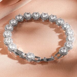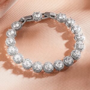 Bracelet : Timeless elegance meets radiant sparkle with this exquisite round-cut tennis bracelet. Featuring a row of dazzling, precisely set stones, this bracelet adds the perfect touch of glamour to any outfit. The sleek silver-tone setting enhances the brilliance of each stone, making it an ideal accessory for special occasions or everyday luxury. Secure and comfortable to wear, this bracelet is a must-have addition to your jewelry collection. Occasion : Bring your style to a whole new level with this handcrafted piece of jewellery. When you’re celebrating a special Occasion : – a birthday, wedding, or personal milestone – this piece adds that extra something that makes us feel special and looking our best. Material : & Care Dimension : Length : 18.3 cm, Width: 0.4 cm Net Weight: 18.12 g Net Quantity : 1 Bracelet Material :Brass Care Label : It is advisable to avoid contact with water and organic chemicals i.e. perfume sprays. Store jewellery in airtight box. After use, wipe the jewellery with soft cotton cloth.