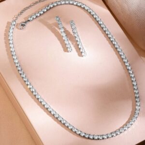 Jewellery Set : Add a touch of sophistication with Rhodium-Plated Tennis Necklace Set, adorned with sparkling cubic zirconia and matching drop earrings, designed for timeless elegance. Occasion : Bring your style to a whole new level with this handcrafted piece of jewellery. When you’re celebrating a special Occasion : – a birthday, parties, wedding, festive or personal milestone – this piece adds that extra something that makes us feel special and looking our best. Material & Care Material : Brass Dimension :Necklace – Length : 19 cm ; Earring : 3.8 cm Necklace – Width : 0.4 cm ; Earring : 0.4 cm Weight : 19.88 Gram Net Quantity : 1 Necklace & 1 Pair of Earrings Care Label : It is advisable to avoid contact with water and organic chemicals i.e. perfume sprays. Store jewellery in airtight box. After use, wipe the jewellery with soft cotton cloth.