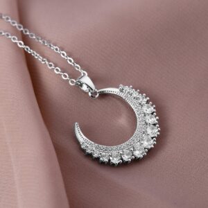 Rhodium Plated Stainless Steel Tarnish-Free Waterproof Zirconia Studded Half Moon Necklace – Silver Plated