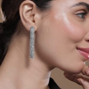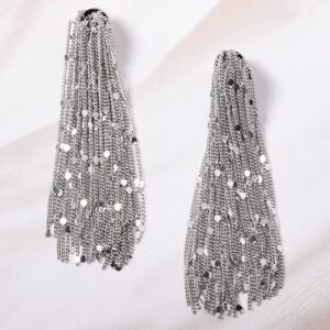 Earrings : Elevate your style with these stunning rhodium-plated tassel chain earrings. Featuring cascading chains that create a dynamic and elegant look, these earrings are perfect for adding a touch of glamour to your ensemble. The sleek design and shimmering finish make them a versatile accessory for any occasion, ensuring you stand out with every wear. Occasion : Bring your style to a whole new level with this handcrafted piece of jewellery. When you’re celebrating a special Occasion : – a birthday, wedding, or personal milestone – this piece adds that extra something that makes us feel special and looking our best. Material : & Care Dimension : Size : Length : 6 cm, Width : 0.8 cm Material :Brass Weight : 12.54g Net Qnty : 1 Pair Earrings Care Label : It is advisable to avoid contact with water and organic chemicals i.e. perfume sprays. Store jewellery in airtight box. After use, wipe the jewellery with soft cotton cloth.