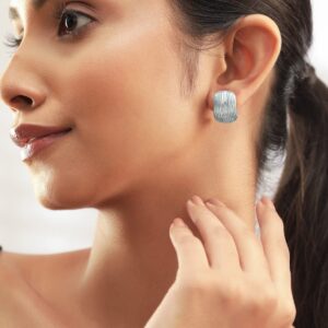 These stunning rhodium-plated stud earrings feature a modern textured design, adding a touch of sophistication to any outfit. Perfect for both casual and formal occasions. Material & Care Dimension : Length : 2 cm ; Width : 1 cm Material : Brass Care Label : It is advisable to avoid contact with water and organic chemicals i.e. perfume sprays. Store jewellery in airtight box. After use, wipe the jewellery with soft cotton cloth.