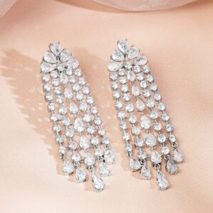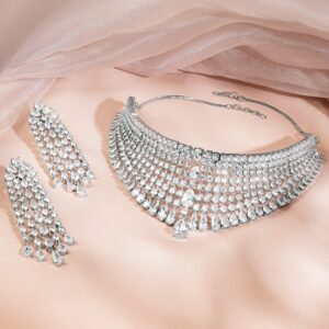 Jewellery Set : This luxurious rhodium-plated choker set is encrusted with white AAA cubic zirconia stones, making it a dazzling choice for women attending parties, receptions, and glamorous celebrations. Occasion : Bring your style to a whole new level with this handcrafted piece of jewellery. When you’re celebrating a special Occasion : – a birthday, wedding, parties or personal milestone – this piece adds that extra something that makes us feel special and looking our best. Material & Care Dimension : Length : 18.5 cm / 6 cm, Width: 8 cm / 2.5 cm Net Weight: 116.08 g Plating : Rhodium Plated Net Quantity : 1 Necklace & 1 Pair of Earrings Material : Brass Collections : AD & Cubic Zirconia Care Label : It is advisable to avoid contact with water and organic chemicals i.e. perfume sprays. Store jewellery in airtight box. After use, wipe the jewellery with soft cotton cloth.