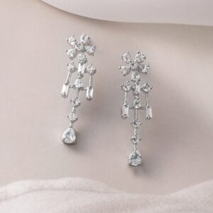 This rhodium-plated premium jewelry set features a stunning necklace and matching earrings. Adorned with white AD and cubic zirconia stones, it adds elegance and sparkle to any occasion. Material: Wipe with a clean, dry cloth to remove dust Size : Necklace : 21 cm, Earrings : 4 cm