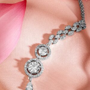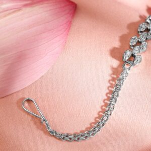 Head Jewellery : A classy white cubic zircon maang tikka, rhodium-plated for an elegant and timeless look. Occasion : Bring your style to a whole new level with this handcrafted piece of jewellery. When you’re celebrating a special Occasion : – a birthday, wedding, or personal milestone – this piece adds that extra something that makes us feel special and looking our best. Material : & Care Dimension : Length : 12.5 cm, Width: 1.5 cm Net Quantity : 1 Maang Tikka Net Weight: 7.1 g Material :Brass Care Label : It is advisable to avoid contact with water and organic chemicals i.e. perfume sprays. Store jewellery in airtight box. After use, wipe the jewellery with soft cotton cloth.