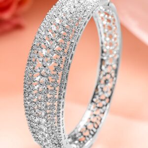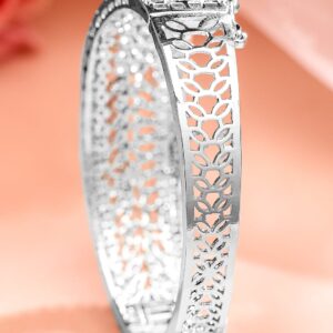 Crafted for sophistication, this rhodium-plated bracelet showcases a stunning openwork design, encrusted with dazzling white cubic zirconia stones. The openable feature ensures a comfortable fit while maintaining a luxurious appeal. A statement piece for both grand occasions and everyday wear, this bracelet exudes timeless brilliance and premium craftsmanship. Material & Care Dimension : Free Size Material: Brass Net Weight: 23.61 Gram Net Quantity: 1 Bracelet Care Label: It is advisable to avoid contact with water and organic chemicals i.e. perfume sprays. Store jewellery in airtight box. After use, wipe the jewellery with soft cotton cloth.