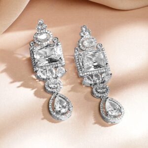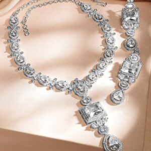 Necklace Set : A breathtaking jewellery set encrusted with radiant white cubic zirconia in pear and emerald cuts, framed by shimmering accents. Rhodium-plated for a lasting shine, this masterpiece is perfect for grand occasions. Occasion : Bring your style to a whole new level with this handcrafted piece of jewellery. When you’re celebrating a special Occasion : – a birthday, wedding, or personal milestone – this piece adds that extra something that makes us feel special and looking our best. Material : & Care Dimension : Size : Neckace : 42 cm, Earrings : 2 cm Net Quantity : 1 Necklace & 2 Earrings Net Weight: 72 g Material :Brass Care Label : It is advisable to avoid contact with water and organic chemicals i.e. perfume sprays. Store jewellery in airtight box. After use, wipe the jewellery with soft cotton cloth.