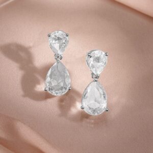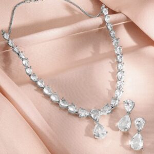 Jewellery Set : This rhodium-plated statement necklace set features dazzling white cubic zirconia stones in a pear-cut design, paired with matching earrings for a luxurious touch. Occasion : Bring your style to a whole new level with this handcrafted piece of jewellery. When you’re celebrating a special Occasion : – a birthday, wedding, or personal milestone – this piece adds that extra something that makes us feel special and looking our best. Material : & Care Dimension : Length : 30 cm / 2.3 cm, Width: 5 cm / 2.3 cm Net Quantity : 1 Necklace & 2 Earrings Net Weight: 25.5 g Material :Brass Care Label : It is advisable to avoid contact with water and organic chemicals i.e. perfume sprays. Store jewellery in airtight box. After use, wipe the jewellery with soft cotton cloth.