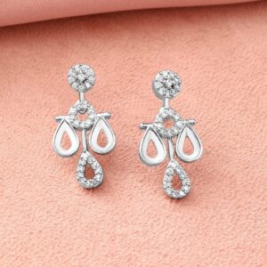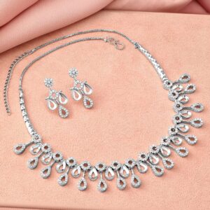 Jewellery Set : This elegant rhodium-plated necklace set by features sparkling white cubic zirconia stones, forming a graceful teardrop pattern. Comes with matching earrings for a dazzling look. Occasion : Bring your style to a whole new level with this handcrafted piece of jewellery. When you’re celebrating a special Occasion : – a birthday, wedding, or personal milestone – this piece adds that extra something that makes us feel special and looking our best. Material : & Care Dimension : Length : Necklace : NS- 11; E- 2 cm Width : NS- 2; E- 1.3 W Material :Brass Care Label : It is advisable to avoid contact with water and organic chemicals i.e. perfume sprays. Store jewellery in airtight box. After use, wipe the jewellery with soft cotton cloth.