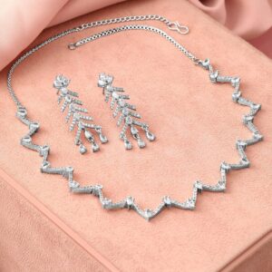 Jewellery Set : rhodium-plated necklace set featuring a striking zigzag pattern adorned with white cubic zirconia stones. Paired with matching drop earrings, this set adds a bold touch to any outfit. Occasion : Bring your style to a whole new level with this handcrafted piece of jewellery. When you’re celebrating a special Occasion : – a birthday, wedding, or personal milestone – this piece adds that extra something that makes us feel special and looking our best. Material : & Care Dimension : Length : NS- 11; E- 4.3 cm Width : NS- 0.5; E- 1.5 cm Material :Brass Care Label : It is advisable to avoid contact with water and organic chemicals i.e. perfume sprays. Store jewellery in airtight box. After use, wipe the jewellery with soft cotton cloth.