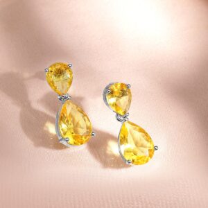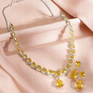 Jewellery Set : This rhodium-plated necklace set features dazzling yellow sapphire AD and cubic zirconia stones, paired with matching earrings. A perfect choice for a statement look. Occasion : Bring your style to a whole new level with this handcrafted piece of jewellery. When you’re celebrating a special Occasion : – a birthday, wedding, or personal milestone – this piece adds that extra something that makes us feel special and looking our best. Material : & Care Dimension : Length : 30 cm / 2.3 cm, Width: 5 cm / 2.3 cm Net Quantity : 1 Necklace & 2 Earrings Net Weight: 25.5 g Material :Brass Care Label : It is advisable to avoid contact with water and organic chemicals i.e. perfume sprays. Store jewellery in airtight box. After use, wipe the jewellery with soft cotton cloth.