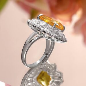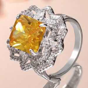 Ring : This luxurious rhodium-plated ring features a bold yellow sapphire centre stone, framed with dazzling white cubic zirconia in a floral pattern, perfect for festive, party or wedding looks. Occasion-Ready Elegance: Ideal for weddings, festive occasions, cocktail parties, and glamorous evenings. Material : & Care Dimension : Adjustable Ring Net Weight: 32 Gram Net Quantity : 1 Ring Material : Brass Care Label : It is advisable to avoid contact with water and organic chemicals i.e. perfume sprays. Store jewellery in airtight box. After use, wipe the jewellery with soft cotton cloth.