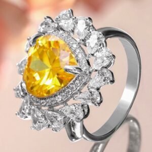 Ring : This rhodium-plated heart halo ring with radiant yellow sapphire and shimmering cubic zirconia, crafted in brass for a luxurious party, wedding, or festive look. Perfect for Elegant Styling: Whether paired with ethnic or western attire, this statement ring adds glamour and grace, ideal for cocktail events, festive gatherings, and special celebrations. Material : & Care Dimension : Ring Size : 6 Size Material : Brass Net Quantity : 1 Ring Net Weight : 18 Gram Care Label : It is advisable to avoid contact with water and organic chemicals i.e. perfume sprays. Store jewellery in airtight box. After use, wipe the jewellery with soft cotton cloth.