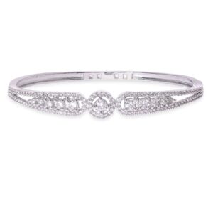 Sleek Sophistication: A Rhodium-Plated Classy Bracelet adorned with glistening Zirconia stones, epitomizing timeless elegance and refinement. Material & Care Dimension : Free Size Material: Brass Net Weight: 10.96 Gram Net Quantity: 1 Bracelet Care Label: It is advisable to avoid contact with water and organic chemicals i.e. perfume sprays. Store jewellery in airtight box. After use, wipe the jewellery with soft cotton cloth.