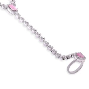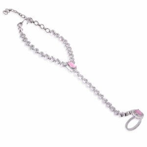 “Fashionable Brilliance: Rhodium-plated Hathphool (hand jewelry) adorned with shimmering Zirconia stones, adding a touch of glamour and sophistication to your ensemble.” Material & Care Length : Free Size Material: Brass Net Weight: 21.79 Gram Net Quantity: 1 Bracelet Care Label: It is advisable to avoid contact with water and organic chemicals i.e. perfume sprays. Store jewellery in airtight box. After use, wipe the jewellery with soft cotton cloth.