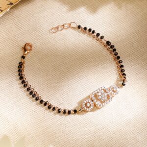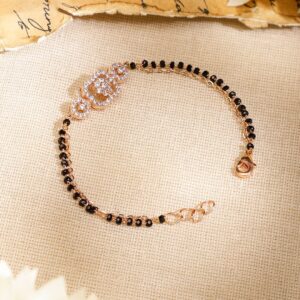 Bracelet : This rose gold-plated mangalsutra bracelet features dual strands of black beads and white cubic zirconia floral motifs—perfect for everyday elegance and traditional wear for married women. Occasion : Bring your style to a whole new level with this handcrafted piece of jewellery. When you’re celebrating a special Occasion : – a birthday, wedding, festive or personal milestone – this piece adds that extra something that makes us feel special and looking our best. Material : & Care Dimension : Length : 17 cm, Width : 1 cm Net Weight: 3.83 gram Net Quantity : 1 Bracelet Material :Brass Care Label : It is advisable to avoid contact with water and organic chemicals i.e. perfume sprays. Store jewellery in airtight box. After use, wipe the jewellery with soft cotton cloth.