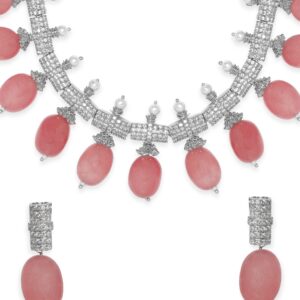 Embrace the allure of rose petal elegance with our Pink Beaded AD Necklace Set. This enchanting ensemble features delicate pink beads meticulously crafted into an intricate AD pattern, creating a harmonious blend of grace and sophistication. The necklace set exudes a timeless charm, perfect for adding a touch of romantic allure to your attire. Adorn yourself with this fanciful and elegant necklace set, destined to enhance your look with a touch of ethereal beauty and refined style. Material & Care Dimension : Necklace : 14 cm Earrings : 3 cm Material: Brass Net Weight: 82.73 Gram Net Quantity: 1 Necklace & 1 Pair of Earrings Care Label: It is advisable to avoid contact with water and organic chemicals i.e. perfume sprays. Store jewellery in airtight box. After use, wipe the jewellery with soft cotton cloth.