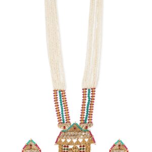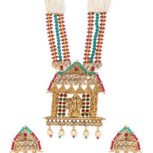 “Divine Union” necklace set, inspired by temple jewellery and celebrating the eternal bond of Lord Krishna and Radha. This exquisite ensemble showcases a gold-tone pendant intricately crafted to depict the divine couple, with pearls delicately suspended from the pendant, symbolizing purity and grace. The pendant gracefully hangs from a chain embellished with white beads, evoking the essence of traditional temple jewellery. Occasion : Bring your style to a whole new level with this handcrafted piece of jewellery. When you’re celebrating a special Occasion : – a birthday, wedding, or personal milestone – this piece adds that extra something that makes us feel special and looking our best. Material & Care Dimension : Necklace : 68 cm Earrings : 5 cm Material: Brass Net Weight: 110.12 Gram Net Quantity: 1 Necklace & 1 Pair of Earrings Care Label: It is advisable to avoid contact with water and organic chemicals i.e. perfume sprays. Store jewellery in airtight box. After use, wipe the jewellery with soft cotton cloth.
