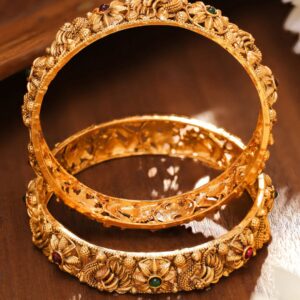 Bangle : This set of 2 bangles is crafted in premium brass and finished with 18K gold plating. Intricately designed with floral patterns, peacock detailing, and embedded with emerald green and ruby pink stones, these bangles exude regal charm, perfect for festive and bridal looks. Bridal & Festive Perfect: This luxurious bangle set is a standout choice for bridal trousseaus, festive outfits, and traditional gatherings, adding grandeur to every movement. Material : & Care Material: Brass Net Weight: 51.01 Gram Net Quantity: 2 Bangles Care Label : It is advisable to avoid contact with water and organic chemicals i.e. perfume sprays. Store jewellery in airtight box. After use, wipe the jewellery with soft cotton cloth.