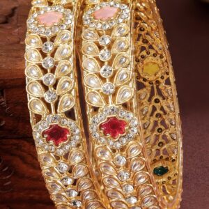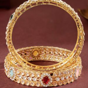 Bangle : This 18K gold-plated brass bangle set features white Kundan stones, Cubic Zirconia, and multi-coloured floral stone detailing—perfect for weddings, poojas, and festive ethnic dressing. Occasion Styling: Ideal for weddings, haldi, poojas, and festive family gatherings. Pair these with silk sarees, embroidered lehengas, or traditional anarkalis for an ornate, culturally rich look. Material : & Care Plating: Gold Plated Material :Brass Net Weight: 53 Gram Net Quantity: 2 Bangles Care Label : It is advisable to avoid contact with water and organic chemicals i.e. perfume sprays. Store jewellery in airtight box. After use, wipe the jewellery with soft cotton cloth.