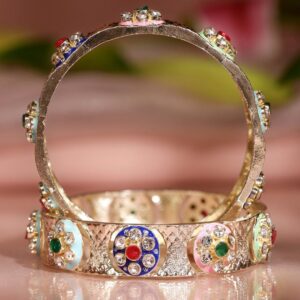 Elevate your traditional look with this set of 2 bangles, beautifully crafted in 18K gold plating with pastel pink, green, and blue enamel detailing. Studded with ruby red, emerald green, and clear cubic zirconia stones, these bangles exude royal elegance, perfect for weddings, festive occasions, and grand celebrations. Occasion : Bring your style to a whole new level with this handcrafted piece of jewellery. When you’re celebrating a special Occasion : – a birthday, wedding, or personal milestone – this piece adds that extra something that makes us feel special and looking our best. Material : & Care Net Weight: 48.30 g Net Quantity : 2 Bangles Material :Brass Care Label : It is advisable to avoid contact with water and organic chemicals i.e. perfume sprays. Store jewellery in airtight box. After use, wipe the jewellery with soft cotton cloth.