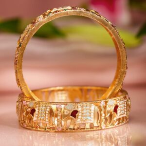 Celebrate heritage craftsmanship with this set of 2 bangles, exquisitely designed with 18K gold plating and intricate elephant motifs. Adorned with pastel enamel detailing and shimmering stone accents, these bangles exude regal charm, making them perfect for weddings, festive occasions, and cultural celebrations. Occasion : Bring your style to a whole new level with this handcrafted piece of jewellery. When you’re celebrating a special Occasion : – a birthday, wedding, or personal milestone – this piece adds that extra something that makes us feel special and looking our best. Material : & Care Net Weight: 52.78 g Net Quantity : 2 Bangles Material :Brass Care Label : It is advisable to avoid contact with water and organic chemicals i.e. perfume sprays. Store jewellery in airtight box. After use, wipe the jewellery with soft cotton cloth.
