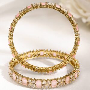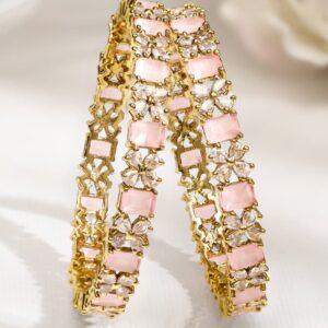Bangle : These gold-plated bangles showcase pastel pink rectangular stones and white cubic zirconia in a delicate floral pattern, perfect for traditional looks, ethnic wear, and elegant festive styling. Festive & Traditional Appeal: Ideal for pairing with sarees, lehengas, and festive kurtas, these bangles make a beautiful addition to bridal trousseaus or celebratory ensembles. Material & Care Material: Brass Plating : Gold Plated Net Weight: 44 Gram Net Quantity: 2 Bangles Care Label : It is advisable to avoid contact with water and organic chemicals i.e. perfume sprays. Store jewellery in airtight box. After use, wipe the jewellery with soft cotton cloth.