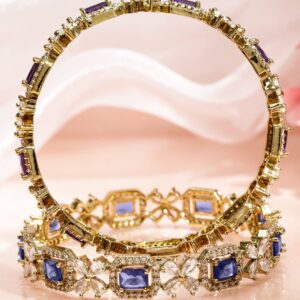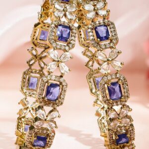 Bangle : These 18K gold-plated bangles are embellished with deep purple rectangular stones and shimmering white zirconia floral motifs, exuding luxurious charm ideal for festive and ethnic wear. Perfect for Bridal & Festive Wear: Ideal for brides, bridesmaids, or festive dressing, these bangles elevate ethnic wear like sarees and lehengas with their bold and traditional flair. Material & Care Material: Brass Plating : Gold Plated Net Weight: 47 Gram Net Quantity: 2 Bangles Care Label : It is advisable to avoid contact with water and organic chemicals i.e. perfume sprays. Store jewellery in airtight box. After use, wipe the jewellery with soft cotton cloth.