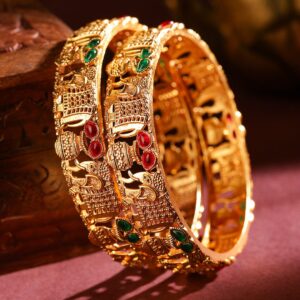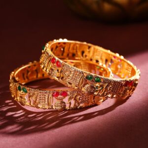 Bangles & Bracelet : This set of 2 18K gold-plated bangles features a Rajwadi polish finish with intricate elephant motifs and exquisite ruby red and emerald green stone detailing. The royal craftsmanship and filigree work add a regal touch, making it an opulent addition to traditional jewelry collections. Occasion : Bring your style to a whole new level with this handcrafted piece of jewellery. When you’re celebrating a special Occasion : – a birthday, wedding, or personal milestone – this piece adds that extra something that makes us feel special and looking our best. Material : & Care Net Quantity : 2 Bangles Net Weight: 41 g Material :Brass Care Label : It is advisable to avoid contact with water and organic chemicals i.e. perfume sprays. Store jewellery in airtight box. After use, wipe the jewellery with soft cotton cloth.