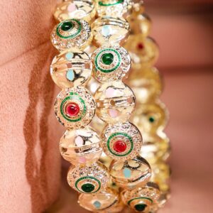 Bangles & Bracelet : These 18K gold-plated handcrafted bangles feature intricate multicolor enamel detailing with red and green stone accents, adding a vibrant and traditional touch to any festive or bridal ensemble. Occasion : Bring your style to a whole new level with this handcrafted piece of jewellery. When you’re celebrating a special Occasion : – a birthday, wedding, or personal milestone – this piece adds that extra something that makes us feel special and looking our best. Material : & Care Net Quantity : 2 Bangles Net Weight: 43.62 g Material :Brass Care Label : It is advisable to avoid contact with water and organic chemicals i.e. perfume sprays. Store jewellery in airtight box. After use, wipe the jewellery with soft cotton cloth.