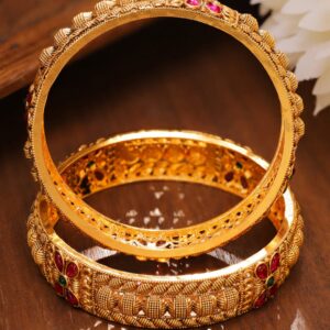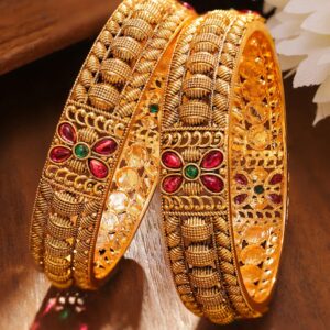 Bangle : These 18K gold-plated bangles are crafted in premium brass with intricate floral patterns, studded with ruby pink and emerald green stones, exuding a luxurious and timeless bridal charm. Perfect for Bridal & Festive Look: Designed to pair beautifully with lehengas or sarees, this bangle set is ideal for weddings, receptions, and traditional celebrations. Material : & Care Material: Brass Net Weight: 57.66 Gram Net Quantity: 2 Bangles Care Label : It is advisable to avoid contact with water and organic chemicals i.e. perfume sprays. Store jewellery in airtight box. After use, wipe the jewellery with soft cotton cloth.