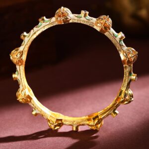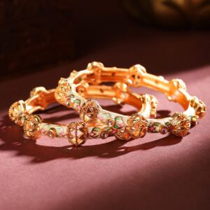 Bangles & Bracelet : Elevate your ethnic elegance with this set of 2 handcrafted 18K gold-plated bangles featuring exquisite white and green enamel detailing with dazzling kundan stones. The intricate filigree beadwork enhances its regal charm, making it a perfect addition to your traditional collection. Occasion : Bring your style to a whole new level with this handcrafted piece of jewellery. When you’re celebrating a special Occasion : – a birthday, wedding, or personal milestone – this piece adds that extra something that makes us feel special and looking our best. Material : & Care Net Quantity : 2 Bangles Net Weight: 47 g Material :Brass Care Label : It is advisable to avoid contact with water and organic chemicals i.e. perfume sprays. Store jewellery in airtight box. After use, wipe the jewellery with soft cotton cloth.