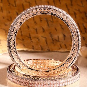 A premium set of 2 bangles in 18K rose gold plating, intricately adorned with white cubic zirconia stones. These timeless bangles exude elegance, making them a luxurious statement piece. Material: Brass Plating : Rose Gold Plated Net Weight: 79.37 Gram Net Quantity: 2 Bangles Care Label: It is advisable to avoid contact with water and organic chemicals i.e. perfume sprays. Store jewellery in airtight box. After use, wipe the jewellery with soft cotton cloth.