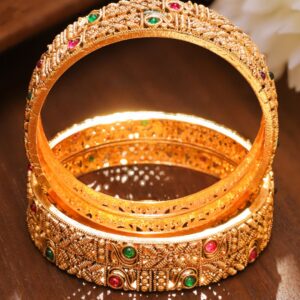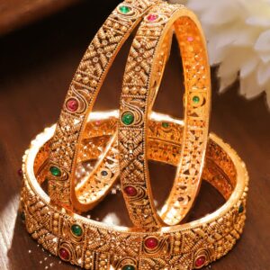 Bangle : This set of 2 antique bangles is crafted in high-quality brass, plated with 22K gold, and adorned with ruby red and emerald green stones – perfect for weddings, parties, and festive looks. Occasion-Perfect Design: A timeless accessory for weddings, Diwali, Navratri, pujas, and family celebrations—these bangles add grandeur to sarees, lehengas, or salwar suits with ease. Material : & Care Material: Brass Net Weight: 64.32 Gram Net Quantity: 2 Bangles Care Label : It is advisable to avoid contact with water and organic chemicals i.e. perfume sprays. Store jewellery in airtight box. After use, wipe the jewellery with soft cotton cloth.