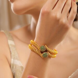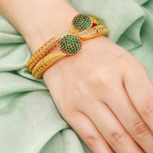 Adorn your wrist with finest handcrafted gold plated bangles studded with emerald color stones. Pair it up and flaunt with your ethnic attire. Occasion : Bring your style to a whole new level with this handcrafted piece of jewelry. When you’re celebrating a special Occasion : – a birthday, wedding, or personal milestone – this piece adds that extra something that makes us feel special and looking our best. Material & Care Material: Brass Net Weight: 40.67 Gram Net Quantity: 2 Bangles Care Label: It is advisable to avoid contact with water and organic chemicals i.e. perfume sprays. Store jewellery in airtight box. After use, wipe the jewellery with soft cotton cloth.