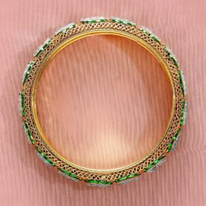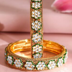 This set of 2 handcrafted 22K gold-plated bangles exudes elegance with intricate floral patterns adorned with premium kundan stones. The green enamel accents enhance the traditional charm, making these bangles perfect for weddings and festive occasions. Occasion : Bring your style to a whole new level with this handcrafted piece of jewellery. When you’re celebrating a special Occasion : – a birthday, wedding, festive or personal milestone – this piece adds that extra something that makes us feel special and looking our best. Material & Care Material : Brass Weight : 57.44g Net Qnty : 2 Bangles Care Label : It is advisable to avoid contact with water and organic chemicals i.e. perfume sprays. Store jewellery in airtight box. After use, wipe the jewellery with soft cotton cloth.