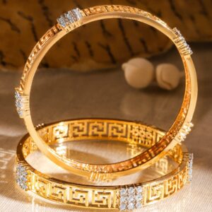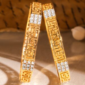 Exquisitely designed set of 2 22K gold-plated handcrafted bangles featuring a Greek key pattern and sparkling cubic zirconia accents. A perfect blend of elegance and intricate artistry. Material: Brass Net Weight: 28.75 Gram Net Quantity: 2 Bangles Care Label: It is advisable to avoid contact with water and organic chemicals i.e. perfume sprays. Store jewellery in airtight box. After use, wipe the jewellery with soft cotton cloth.