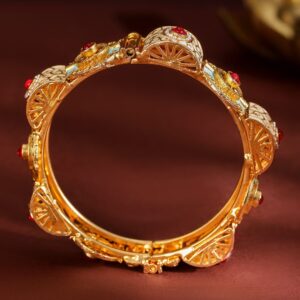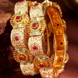 This exquisite set of 2 handcrafted bangles features a 22K gold-plated finish with intricate traditional patterns. Adorned with vibrant red stones, pearl accents, and detailed blue and peach enamel work, these bangles are a perfect blend of elegance and cultural heritage, making them a timeless addition to your jewelry collection. Material: Brass Net Weight: 84.13 Gram Net Quantity: 2 Bangles Care Label: It is advisable to avoid contact with water and organic chemicals i.e. perfume sprays. Store jewellery in airtight box. After use, wipe the jewellery with soft cotton cloth.
