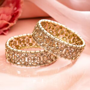 A stunning set of 2, 22K gold-plated bangles, beautifully handcrafted with Kundan & Cubic Zirconia stones and intricate pearl beading, perfect for adding a traditional touch to your ensemble. Material & Care Material : Brass Net Weight: 8 Gram Net Quantity: 2 Bangles Care Label : It is advisable to avoid contact with water and organic chemicals i.e. perfume sprays. Store jewellery in airtight box. After use, wipe the jewellery with soft cotton cloth.