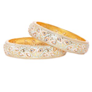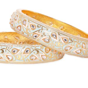 Elevate your fashion with this set of two 22K gold-plated statement bangles, featuring pastel enamel and embellished with Kundan stones. The fusion of soft pastel hues and traditional Kundan craftsmanship creates a captivating blend of modern and ethnic elegance, perfect for making a statement. Material & Care Dimension : One Size Material: Brass Net Weight: 40.61 Gram Net Quantity: 2 Bangles Care Label: It is advisable to avoid contact with water and organic chemicals i.e. perfume sprays. Store jewellery in airtight box. After use, wipe the jewellery with soft cotton cloth.