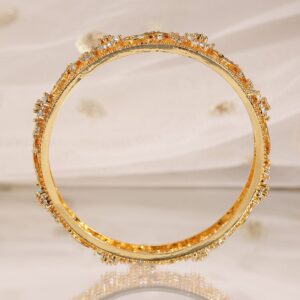 Set of 2 handcrafted 22K gold-plated bangles featuring ruby, emerald, and cubic zirconia stones. Designed with intricate floral patterns, perfect for adding elegance to festive or bridal looks. Material: Brass Net Weight: 44 Gram Net Quantity: 2 Bangles Care Label: It is advisable to avoid contact with water and organic chemicals i.e. perfume sprays. Store jewellery in airtight box. After use, wipe the jewellery with soft cotton cloth.
