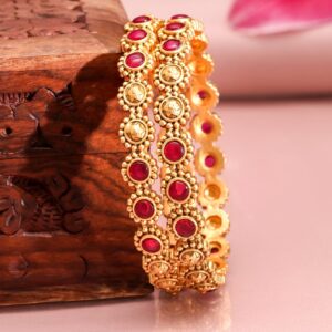 Bangle : This set of 2 22K gold-plated bangles features vibrant ruby pink stones, framed by intricate gold beading in a traditional design. Perfect for adding elegance and charm to any ethnic look. Occasion : Bring your style to a whole new level with this handcrafted piece of jewellery. When you’re celebrating a special Occasion : – a birthday, wedding, or personal milestone – this piece adds that extra something that makes us feel special and looking our best. Material : & Care Dimension : Net Weight: 38,44 g Net Quantity: 2 Bangles Material :Brass Care Label : It is advisable to avoid contact with water and organic chemicals i.e. perfume sprays. Store jewellery in airtight box. After use, wipe the jewellery with soft cotton cloth.