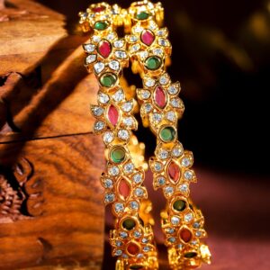 Enhance your grace with this set of 2 handcrafted 22K gold-plated bangles, adorned with ruby pink and emerald green stones, and sparkling cubic zirconia accents for a regal look. Material: Brass Plating : Gold Plated Net Weight: 40.59 Gram Net Quantity: 2 Bangles Care Label: It is advisable to avoid contact with water and organic chemicals i.e. perfume sprays. Store jewellery in airtight box. After use, wipe the jewellery with soft cotton cloth.